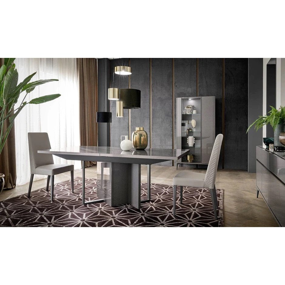 Introducing the Graphite Dining Collection, a remarkable ensemble that showcases a stunning graphite lacquer finish. The collection's meticulous attention to detail is evident through its light wood veneer accents and sophisticated metallic gray metal elements. The table extends from 63" to 83" with the leaf inside.